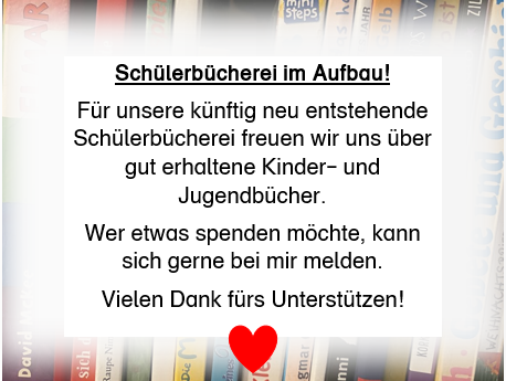 Unsere Schule befindet sich derzeit im Aufbau einer Schülerbücherei, die die Lesefreude und Lesekompetenz unserer Schülerinnen und Schüler fördern soll.Um ein…