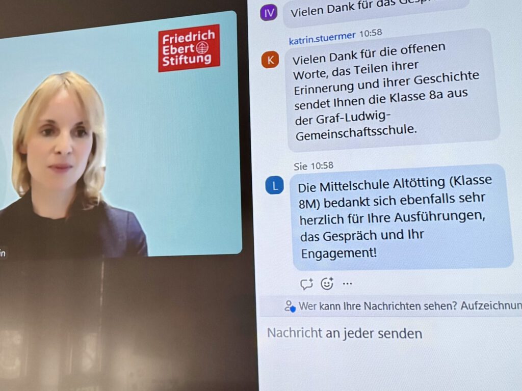 Die Klasse 8M ist dankbar für die Gelegenheit, eine so beeindruckende Persönlichkeit digital im Klassenzimmer begrüßt zu haben. Ein herzlicher Dank gilt der Friedrich-Ebert-Stiftung und natürlich Dr. Charlotte Knobloch, die uns mit ihren Worten Mut, Orientierung und Verantwortung mit auf den Weg gegeben hat.