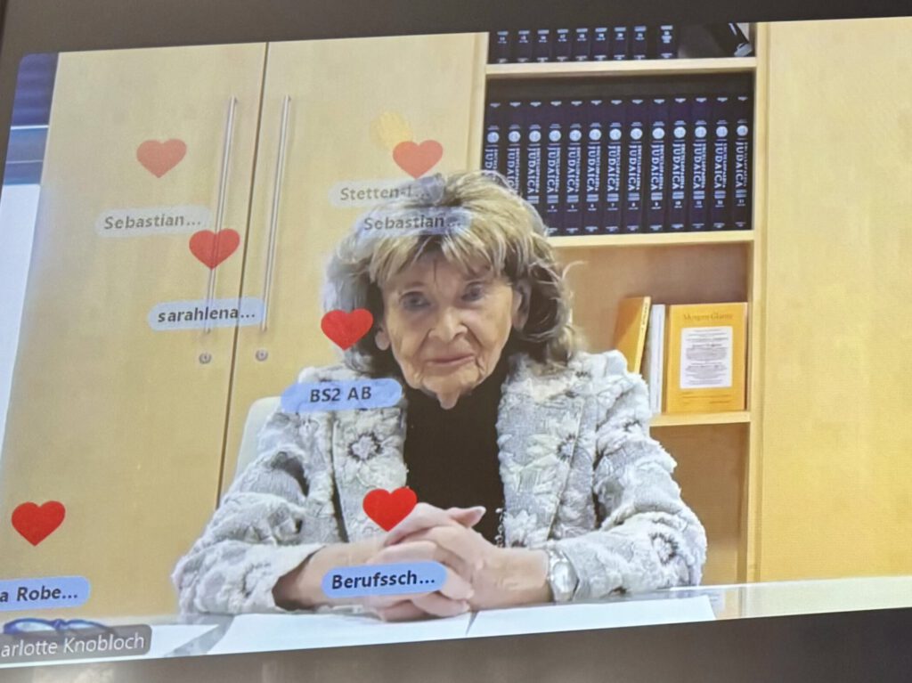Die Klasse 8M durfte heute an einem ganz besonderen digitalen Zeitzeugengespräch teilnehmen: Zu Gast war Dr. h.c. Charlotte Knobloch, eine der wichtigsten Stimmen der jüdischen Gemeinschaft in Deutschland und eine Frau mit einer einzigartigen, bewegenden Lebensgeschichte. Organisiert wurde dieses beeindruckende Format von der Friedrich-Ebert-Stiftung.