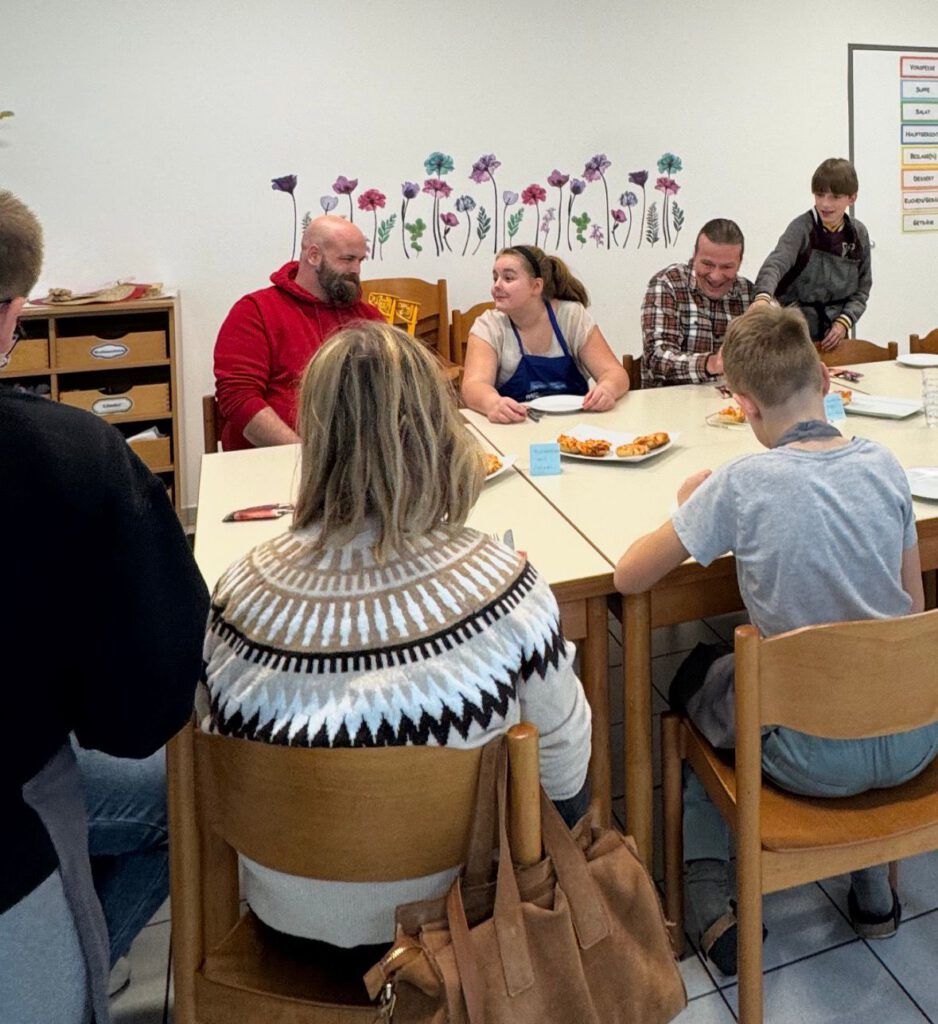 Mit viel Freude und Engagement kochten sie leckere Pizzabrötchen. Dabei wurde fleißig geschnippelt und gebacken. In Gruppen sprechen sich die Schülerinnen und Schüler mittlerweile selbstverständlich ab und teilen sich die Aufgaben. Anschließend deckten die Kinder liebevoll den Tisch, um ihre Eltern willkommen zu heißen.