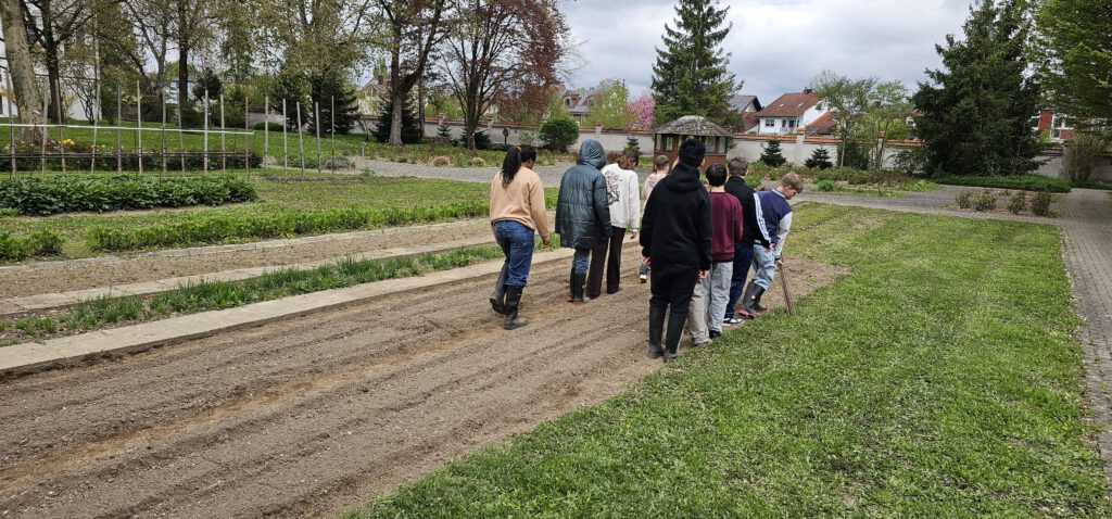Auch im Unterricht wurde das Projekt aktiv aufgegriffen. Die Schülerinnen und Schüler der Klasse 6a beschäftigten sich im Mathematikunterricht mit der Frage, wie die einzelnen Beete sinnvoll eingeteilt und abgesteckt werden können. Sie entwickelten Skizzen, berechneten Maße und setzten ihre Planungen anschließend direkt im Schulgarten praktisch um.
